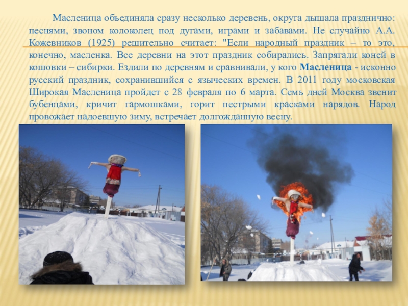 деревень, округа дышала празднично: песнями, звоном колоколец под дугами, играми и забавами. Не случайно А.А. Кожевников (1925) решительно считает: "Если народный праздник – то это, конечно, масленка. Все деревни на этот праздник собирались. Запрягали коней в кошовки – сибирки. Ездили по деревням и сравнивали, у кого Масленица - исконно русский праздник, сохранившийся с языческих времен. В 2011 году московская Широкая Масленица пройдет с 28 февраля по 6 марта. Семь дней Москва звенит бубенцами, кричит гармошками, горит пестрыми красками нарядов. Народ провожает надоевшую зиму, встречает долгожданную весну.