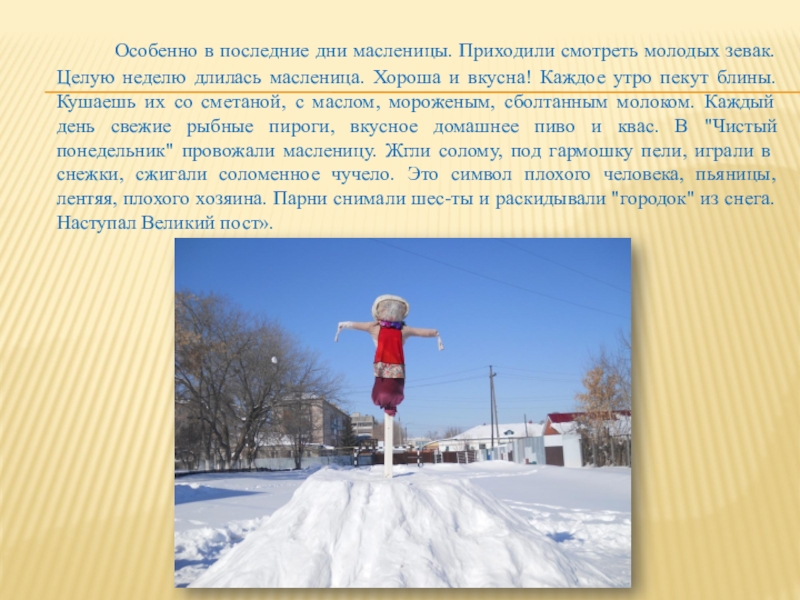 молодых зевак. Целую неделю длилась масленица. Хороша и вкусна! Каждое утро пекут блины. Кушаешь их со сметаной, с маслом, мороженым, сболтанным молоком. Каждый день свежие рыбные пироги, вкусное домашнее пиво и квас. В "Чистый понедельник" провожали масленицу. Жгли солому, под гармошку пели, играли в снежки, сжигали соломенное чучело. Это символ плохого человека, пьяницы, лентяя, плохого хозяина. Парни снимали шес-ты и раскидывали "городок" из снега. Наступал Великий пост».