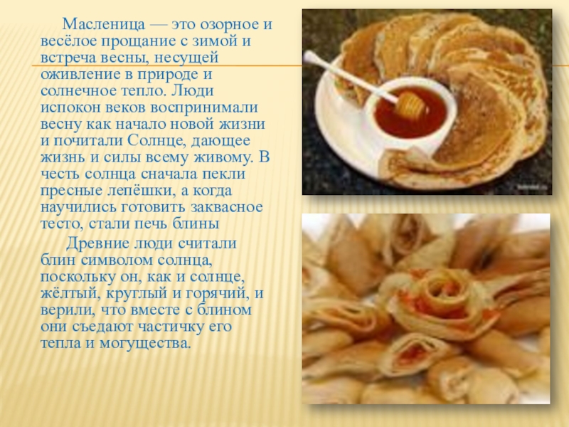 с зимой и встреча весны, несущей оживление в природе и солнечное тепло. Люди испокон веков воспринимали весну как начало новой жизни и почитали Солнце, дающее жизнь и силы всему живому. В честь солнца сначала пекли пресные лепёшки, а когда научились готовить заквасное тесто, стали печь блины
