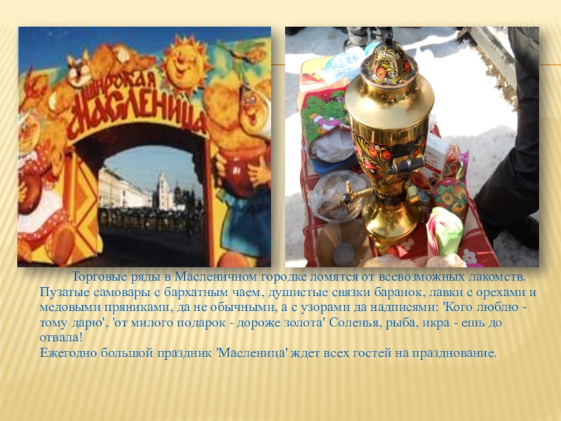 Торговые ряды в Масленичном городке ломятся от всевозможных лакомств. Пузатые самовары с бархатным чаем, душистые связки баранок, лавки с орехами и медовыми пряниками, да не обычными, а с узорами да надписями: 'Кого люблю - тому дарю', 'от милого подарок - дороже золота' Соленья, рыба, икра - ешь до отвала!
