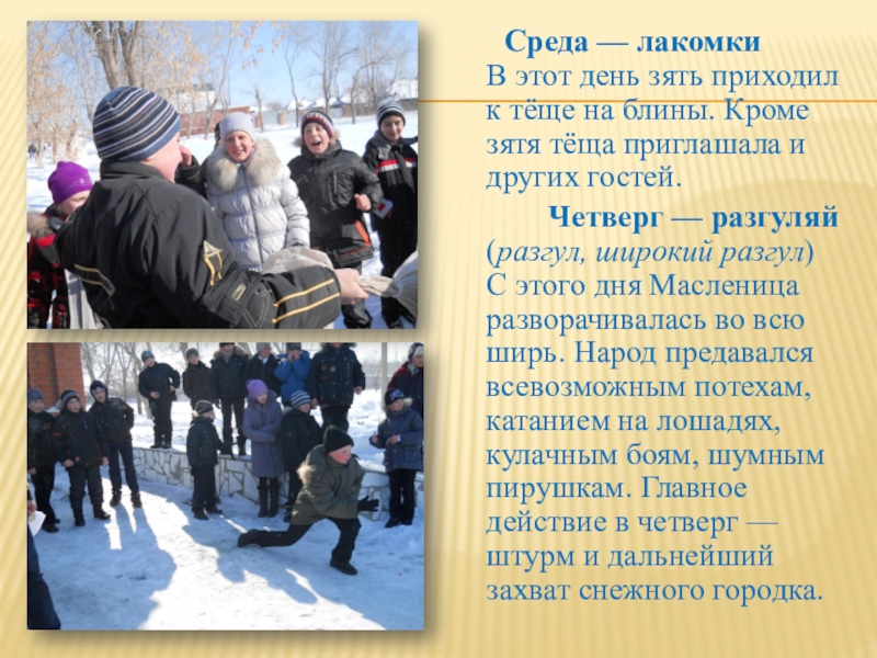 С этого дня Масленица разворачивалась во всю ширь. Народ предавался всевозможным потехам, катанием на лошадях, кулачным боям, шумным пирушкам. Главное действие в четверг — штурм и дальнейший захват снежного городка.