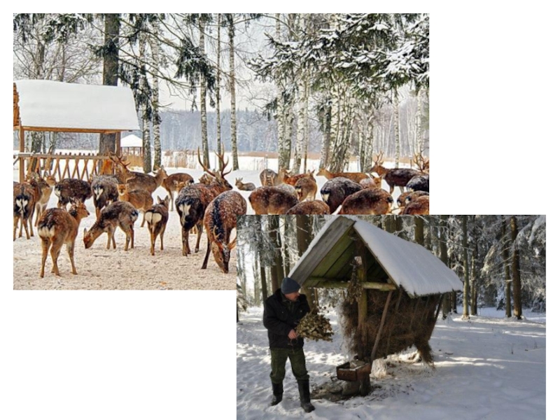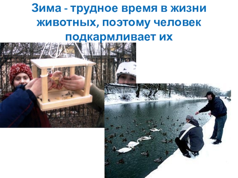 Слайд 17Зима - трудное время в жизни животных, поэтому человек подкармливает их