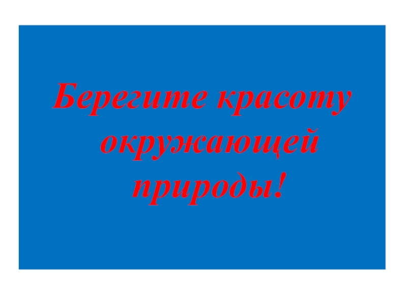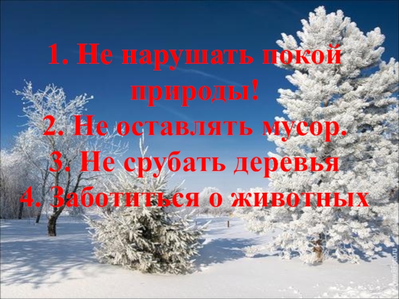 1. Не нарушать покой природы! 2. Не оставлять мусор. 3. Не срубать деревья 4. Заботиться о животных