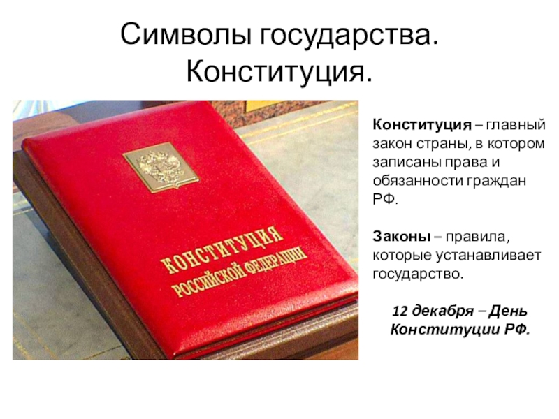 Символы государства. Конституция.Конституция – главный закон страны, в котором записаны права и обязанности граждан РФ.Законы – правила,