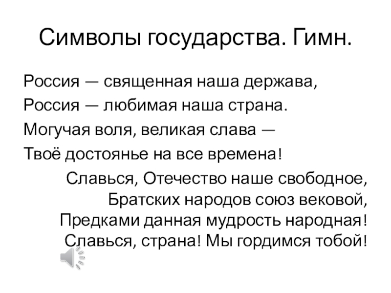 Символы государства. Гимн.Россия — священная наша держава,Россия — любимая наша страна.Могучая воля, великая слава —Твоё достоянье на