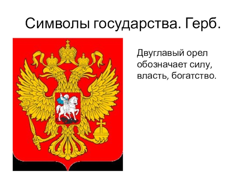 Символы государства. Герб.Двуглавый орел обозначает силу, власть, богатство.