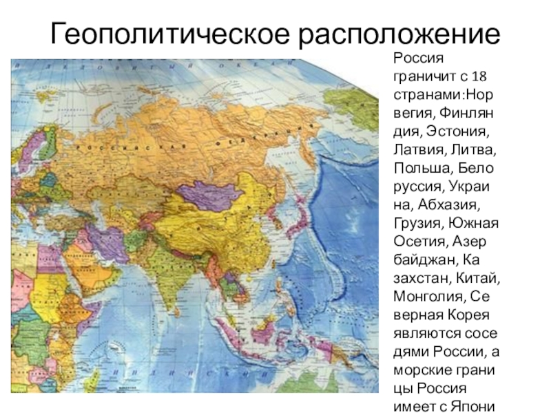 Геополитическое расположение Россия граничит с 18 странами:Нор­ве­гия, Фин­лян­дия, Эс­то­ния, Лат­вия, Литва, Поль­ша, Бе­ло­рус­сия, Укра­и­на, Аб­ха­зия, Гру­зия, Южная