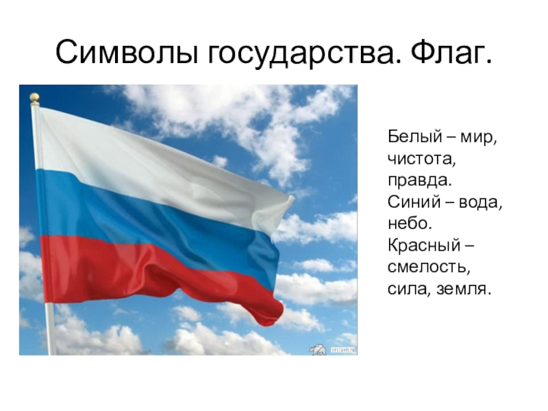 Символы государства. Флаг.Белый – мир, чистота, правда.Синий – вода, небо.Красный – смелость, сила, земля.