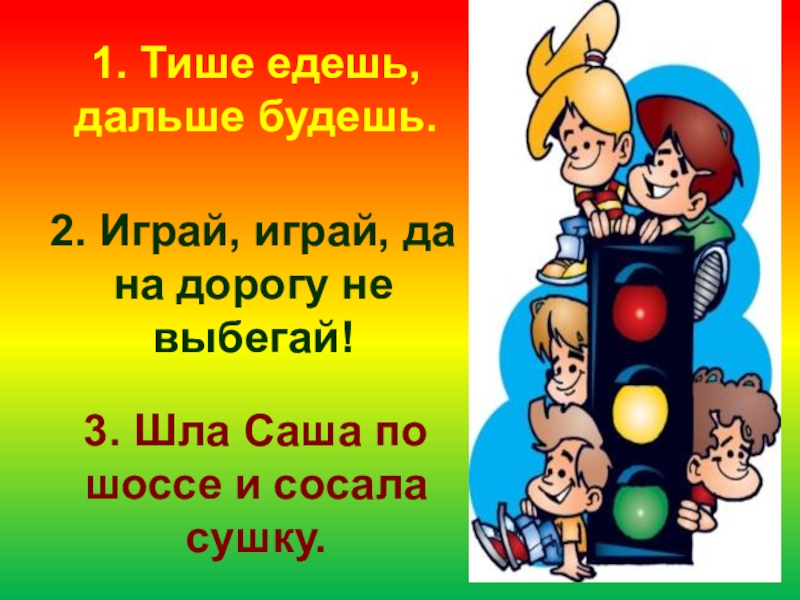 1. Тише едешь, дальше будешь.2. Играй, играй, да на дорогу не выбегай!3. Шла Саша по шоссе и