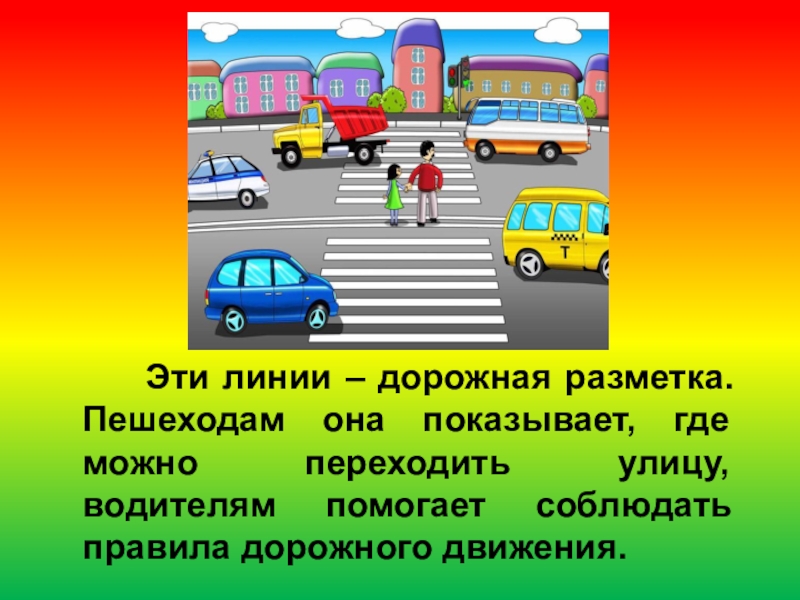 Слайд 9 Эти линии – дорожная разметка. Пешеходам она показывает,