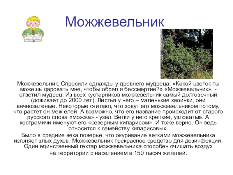 мне, чтобы обрел я бессмертие?» «Можжевельник», - ответил мудрец. Из всех кустарников можжевельник самый долговечный (доживает до 2000 лет). Листья у него – маленькие хвоинки, они вечнозеленые. Некоторые считают, что зовут его можжевельником потому, что растет он меж елей. А возможно, что его название происходит от старого русского слова «можжа» - узел. Ветки у него крепкие, узловатые. А костромичи именуют его «северным кипарисом». И тоже верно. Он ведь относится к семейству кипарисовых.