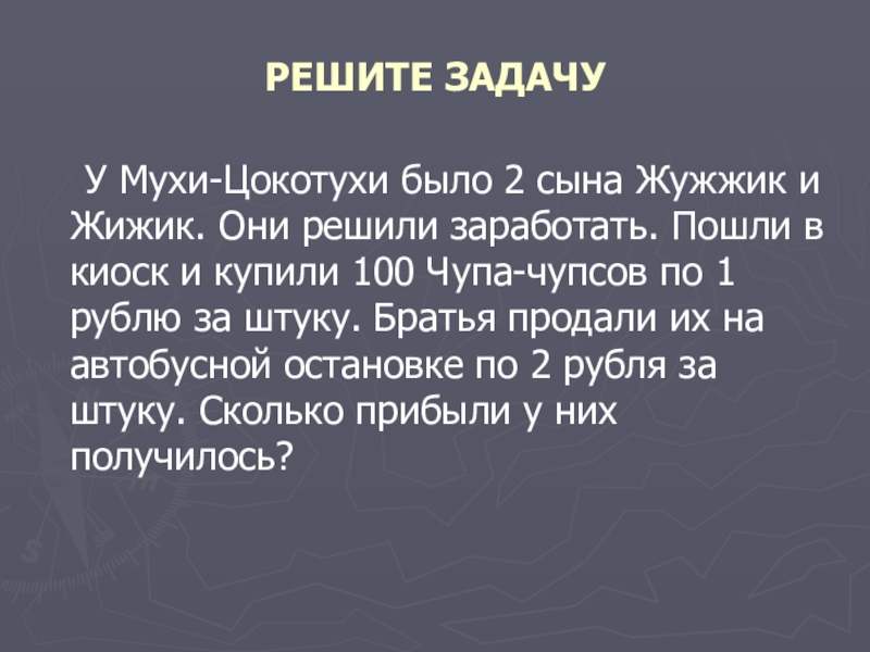 Они решили заработать. Пошли в киоск и купили 100 Чупа-чупсов по 1 рублю за штуку. Братья продали их на автобусной остановке по 2 рубля за штуку. Сколько прибыли у них получилось?