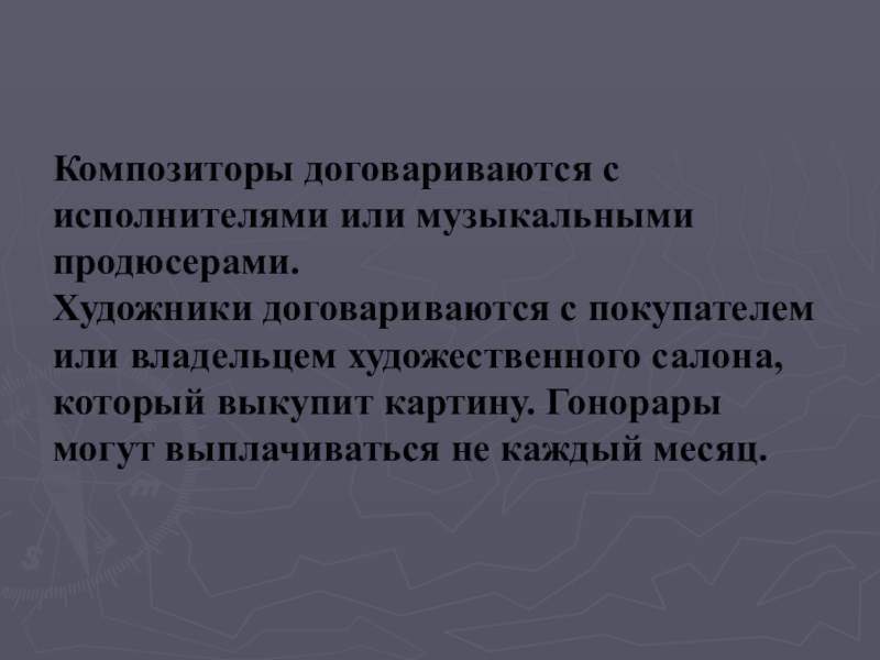 или владельцем художественного салона, который выкупит картину. Гонорары могут выплачиваться не каждый месяц.