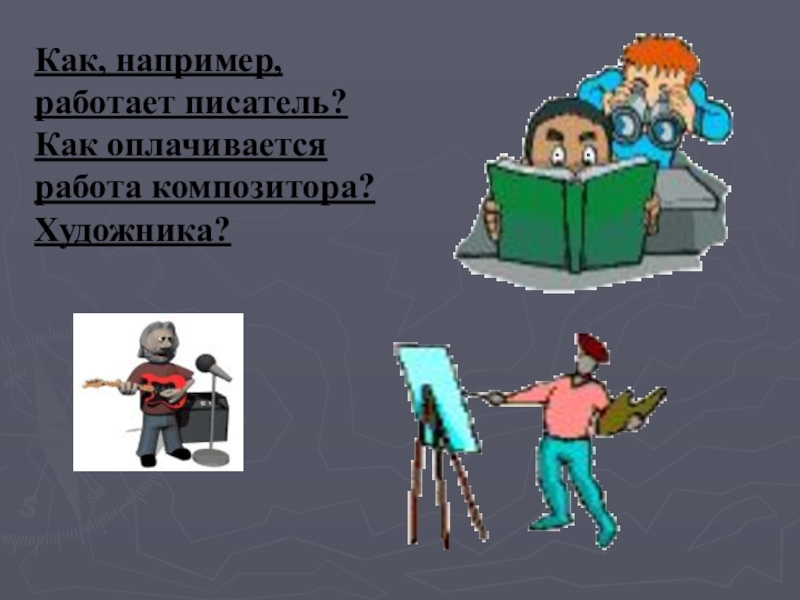 Слайд 10Как, например, работает писатель?