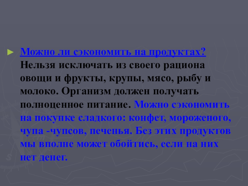 и фрукты, крупы, мясо, рыбу и молоко. Организм должен получать полноценное питание. Можно сэкономить на покупке сладкого: конфет, мороженого, чупа -чупсов, печенья. Без этих продуктов мы вполне может обойтись, если на них нет денег.