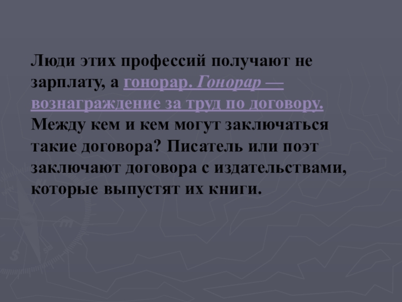 Слайд 11Люди этих профессий получают не зарплату, а гонорар. Гонорар — вознаграждение