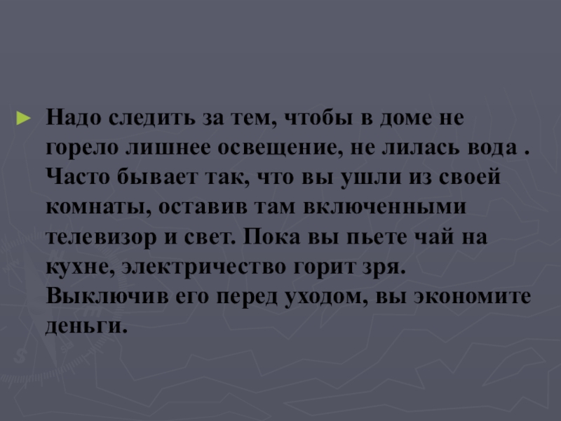 не лилась вода . Часто бывает так, что вы ушли из своей комнаты, оставив там включенными телевизор и свет. Пока вы пьете чай на кухне, электричество горит зря. Выключив его перед уходом, вы экономите деньги.