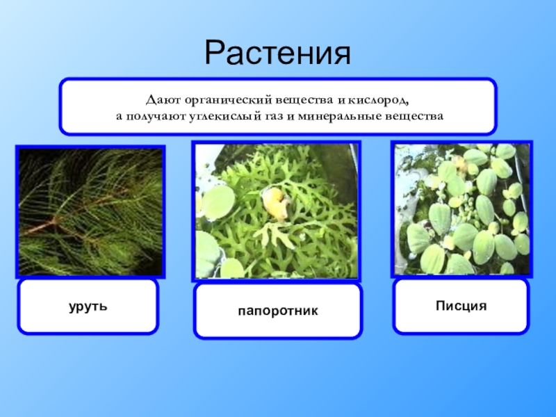 Растения урутьпапоротникПисция Дают органический вещества и кислород, а получают углекислый газ и минеральные вещества