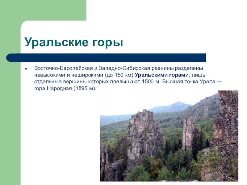 Уральские горыВосточно-Европейская и Западно-Сибирская равнины разделены невысокими и неширокими (до 150 км) Уральскими горами, лишь отдельные вершины