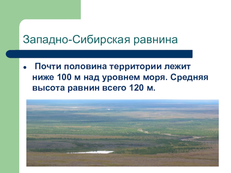 Западно-Сибирская равнина Почти половина территории лежит ниже 100 м над уровнем моря. Средняя высота равнин всего 120