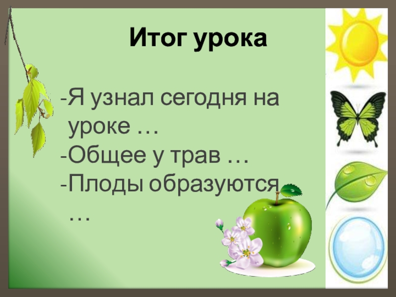 Итог урокаЯ узнал сегодня на уроке …Общее у трав …Плоды образуются …