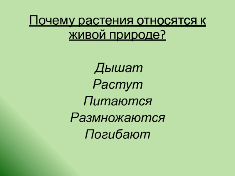 Почему растения относятся к живой природе? ДышатРастутПитаютсяРазмножаютсяПогибают