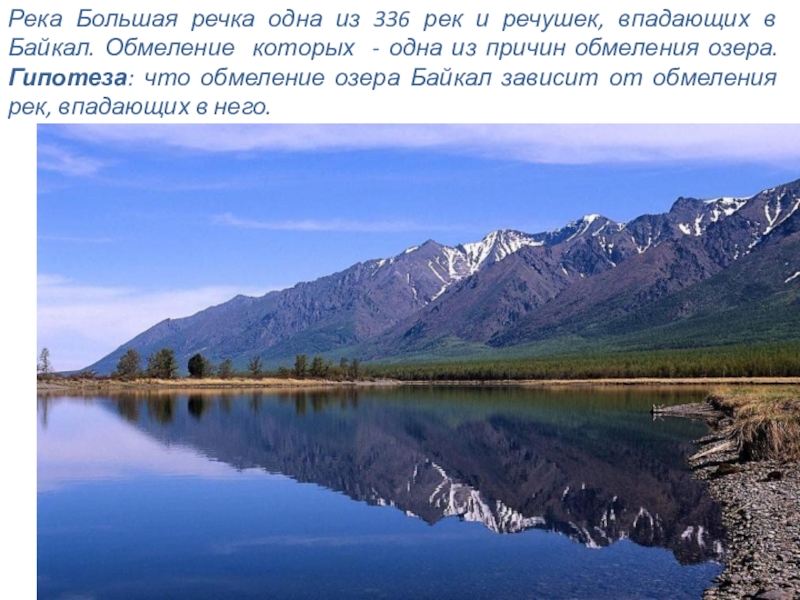 Байкал. Обмеление которых - одна из причин обмеления озера. Гипотеза: что обмеление озера Байкал зависит от обмеления рек, впадающих в него.