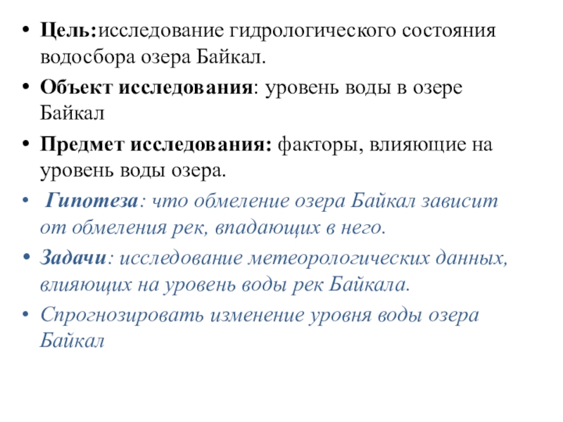 Слайд 2Цель:исследование гидрологического состояния водосбора озера Байкал.