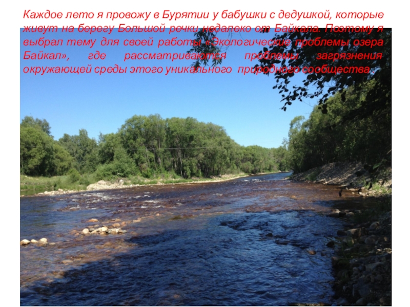 живут на берегу Большой речки недалеко от Байкала. Поэтому я выбрал тему для своей работы «Экологические проблемы озера Байкал», где рассматриваются проблемы загрязнения окружающей среды этого уникального природного сообщества .