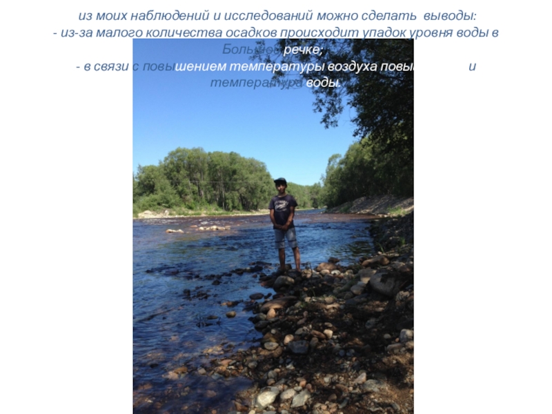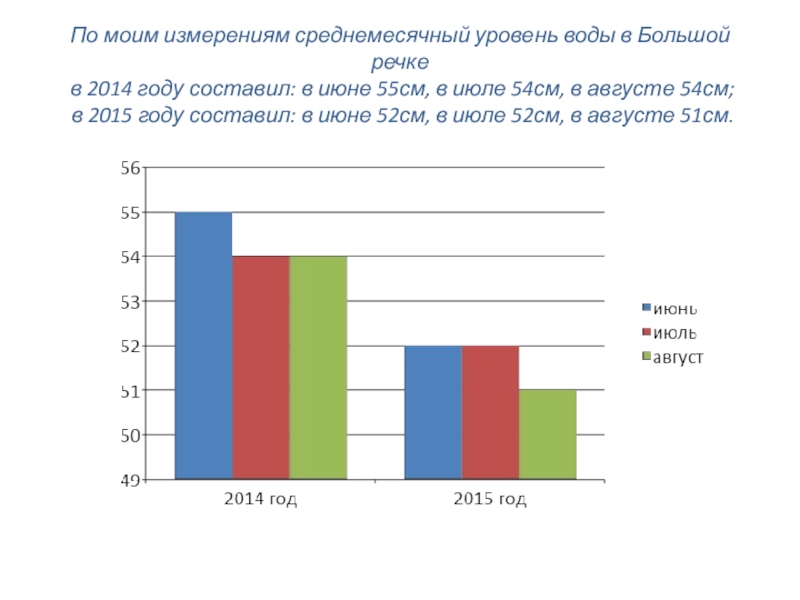 Слайд 11По моим измерениям среднемесячный уровень воды в Большой речке