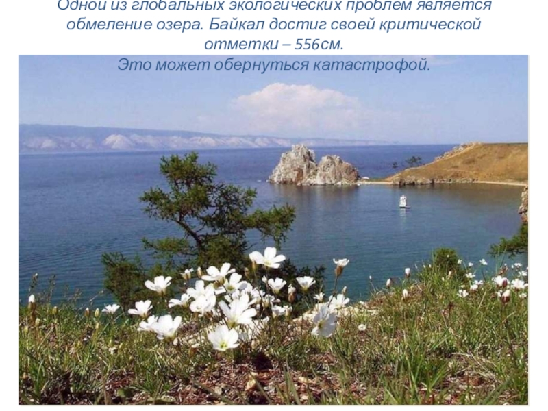 Слайд 7Одной из глобальных экологических проблем является обмеление озера. Байкал достиг своей