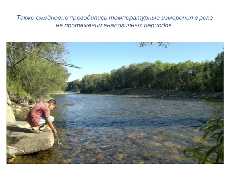 Слайд 12Также ежедневно проводились температурные измерения в реке на протяжении аналогичных периодов.