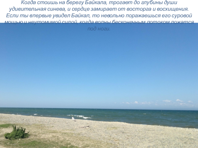 Слайд 4Когда стоишь на берегу Байкала, трогает до глубины души удивительная синева,