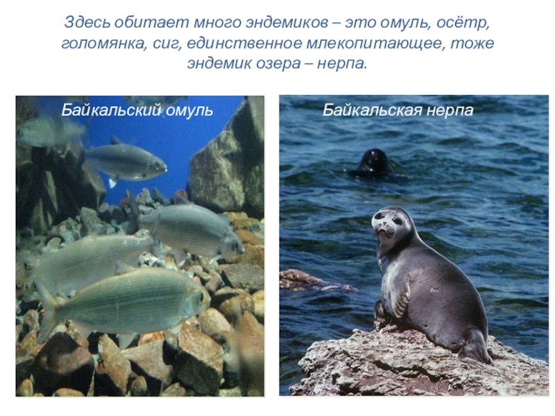 Слайд 6Здесь обитает много эндемиков – это омуль, осётр, голомянка, сиг, единственное