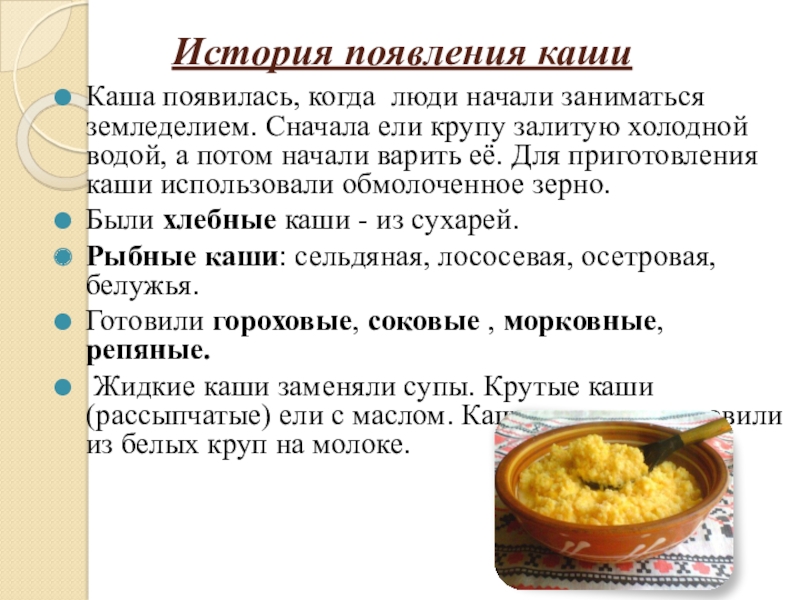 Кашу обязательно готовили по случаю начала большого дела. Отсюда пошло выражение "заварить кашу". Про слабого работника с тех пор говорят: «Мало каши ел».