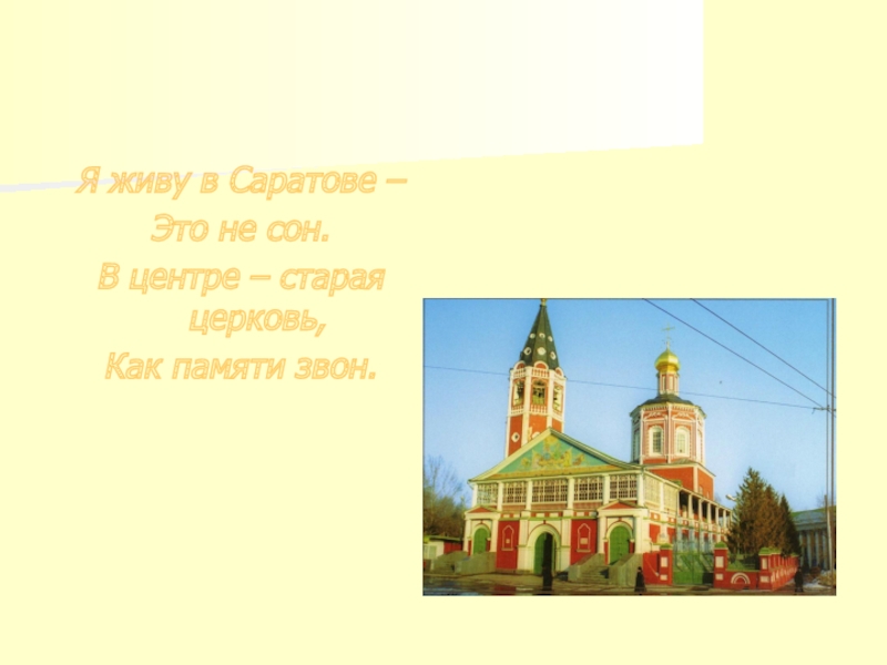 Я живу в Саратове –Это не сон.В центре – старая церковь,Как памяти звон.