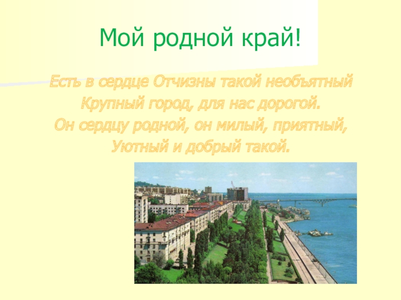 Мой родной край!Есть в сердце Отчизны такой необъятныйКрупный город, для нас дорогой.Он сердцу родной, он милый, приятный,Уютный и добрый такой.