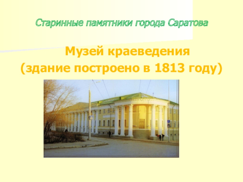 Старинные памятники города Саратова	Музей краеведения (здание построено в 1813 году)