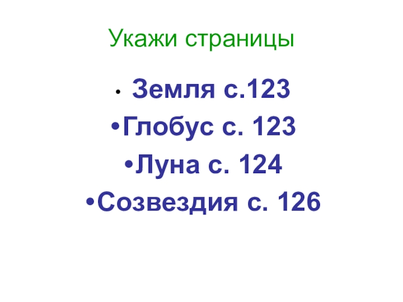 Укажи страницы Земля с.123Глобус с. 123Луна с. 124Созвездия с. 126