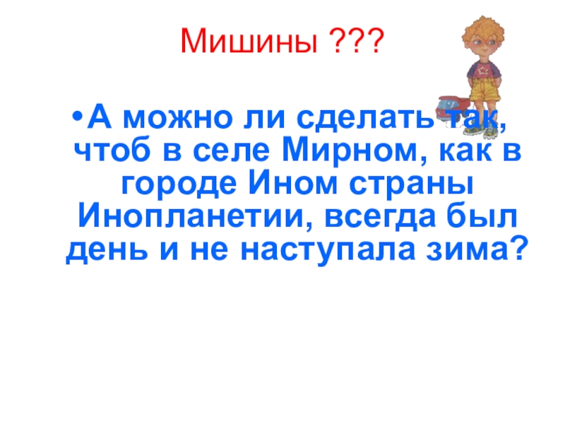 Мишины ???А можно ли сделать так, чтоб в селе Мирном, как в городе Ином страны Инопланетии, всегда
