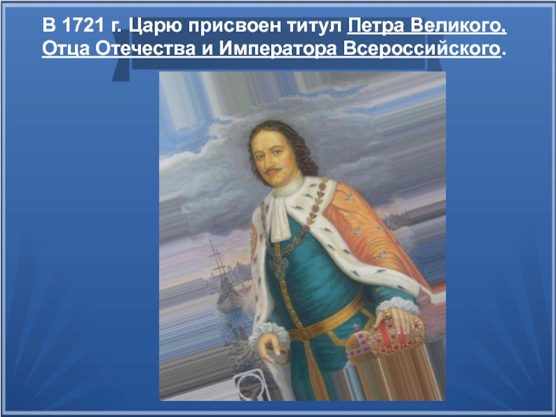 В 1721 г. Царю присвоен титул Петра Великого, Отца Отечества и Императора Всероссийского.