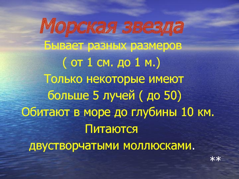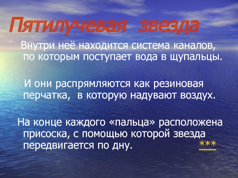 На конце каждого «пальца» расположена присоска, с помощью которой звезда передвигается по дну. ***