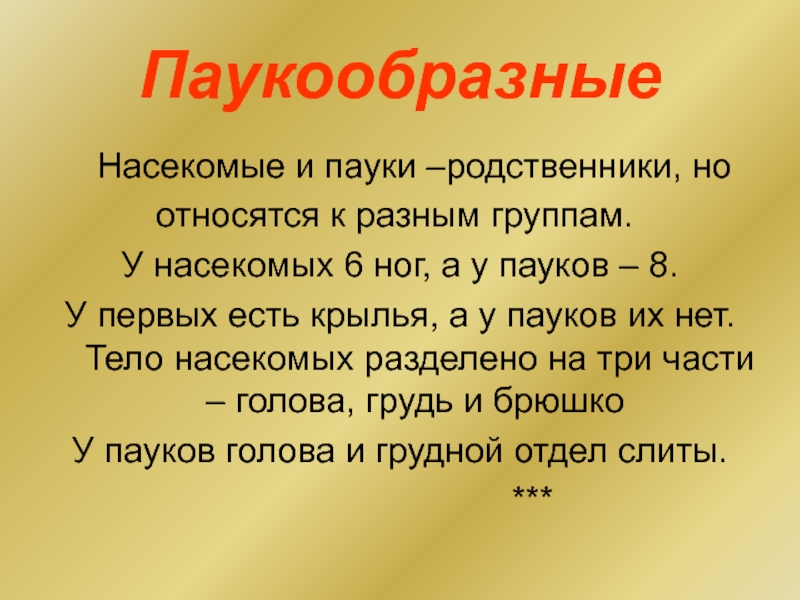 У первых есть крылья, а у пауков их нет. Тело насекомых разделено на три части – голова, грудь и брюшко