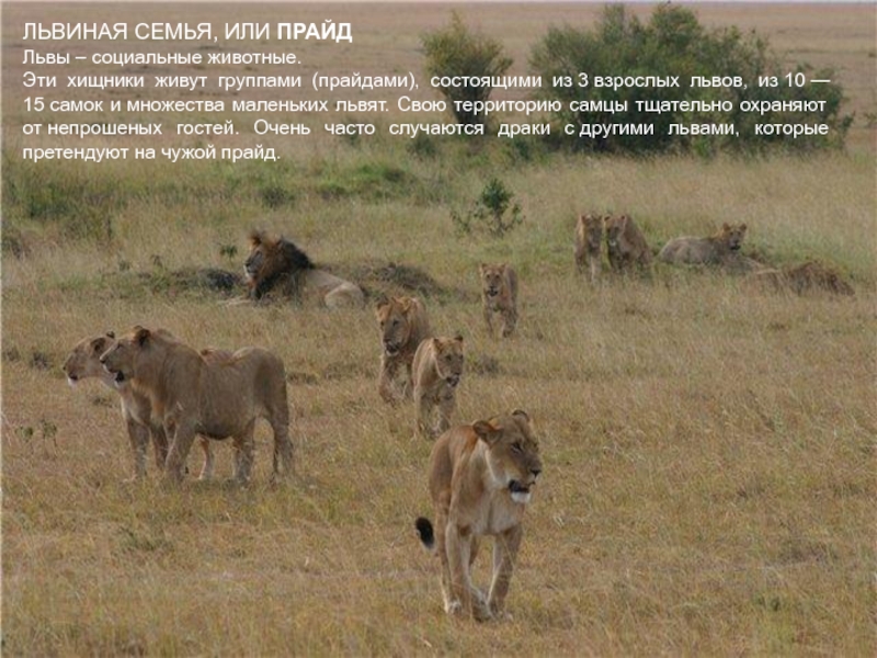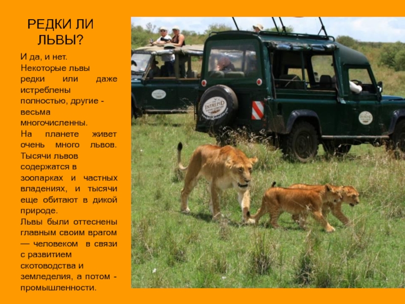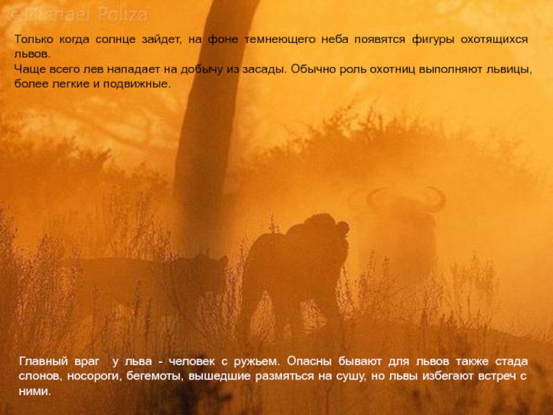 Главный враг у льва - человек с ружьем. Опасны бывают для львов также стада слонов, носороги, бегемоты, вышедшие размяться на сушу, но львы избегают встреч с ними.