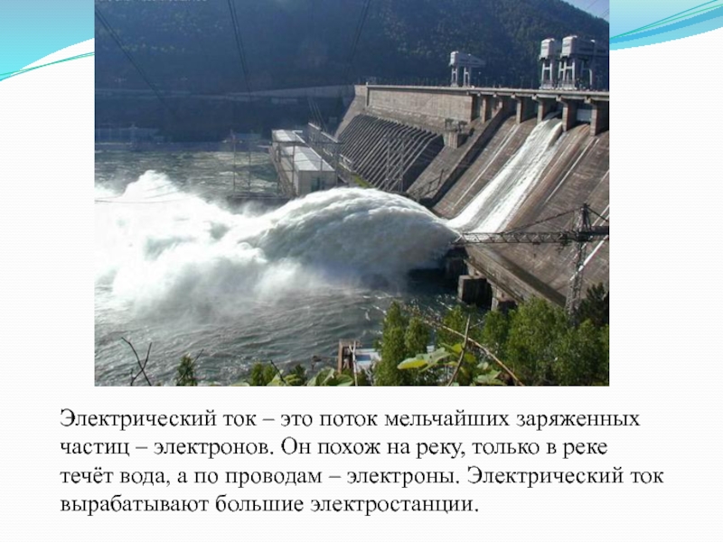 похож на реку, только в реке течёт вода, а по проводам – электроны. Электрический ток вырабатывают большие электростанции.