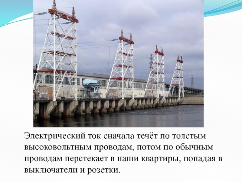 Слайд 13Электрический ток сначала течёт по толстым высоковольтным проводам, потом по обычным
