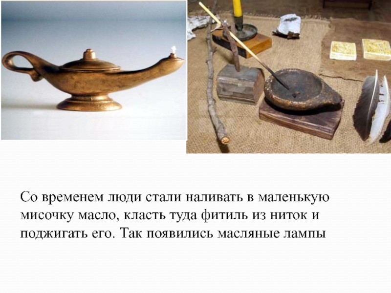 Слайд 7Со временем люди стали наливать в маленькую мисочку масло, класть туда