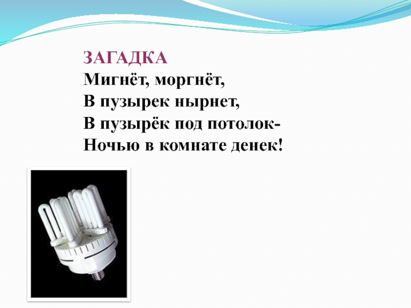 ЗАГАДКАМигнёт, моргнёт,В пузырек нырнет,В пузырёк под потолок-Ночью в комнате денек!