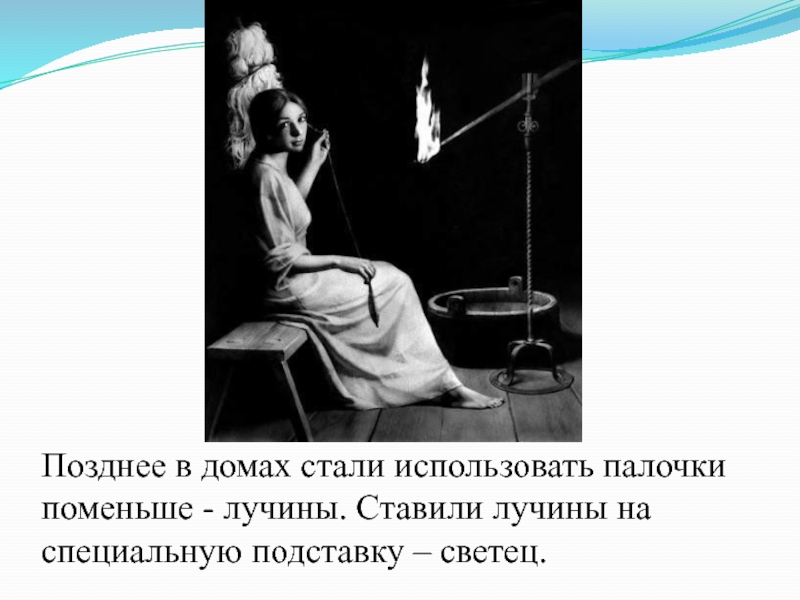 Слайд 6Позднее в домах стали использовать палочки поменьше - лучины. Ставили лучины