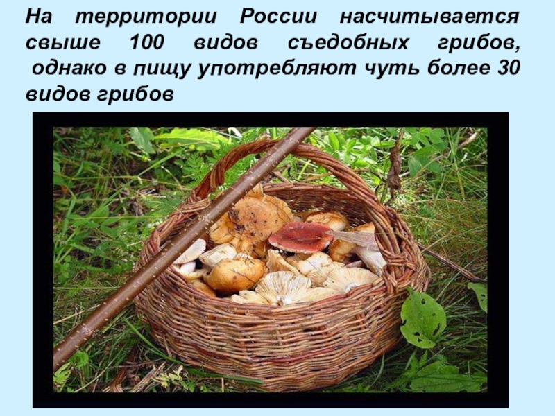 Слайд 4На территории России насчитывается свыше 100 видов съедобных грибов, однако в